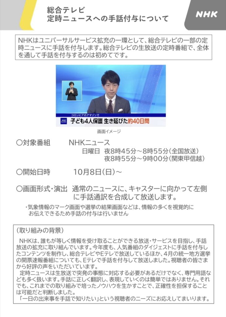 午後8時45分からのNHKの定時ニュースに10月8日から手話通訳が付与されることが発表されました。