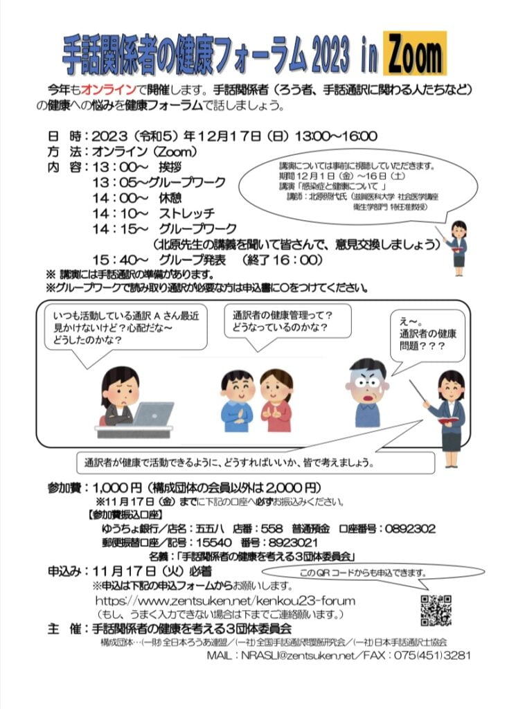 連盟より「手話関係者の健康フォーラム2023 in ZOOM」の案内です。