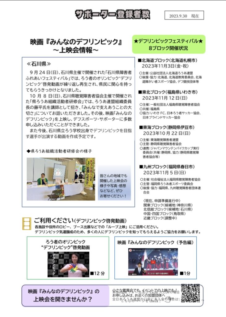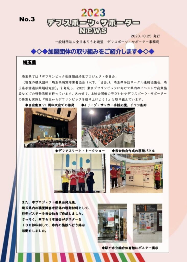 情報共有デフスポーツデフスポーツ・サポーターNEWS No.3 情報共有2023.10.29大聴協事務局からの情報です。連盟からデフスポーツ・サポーターNEWS No.3が送られてきました。デフスポーツ・サポーターのお申し込み2025年デフスポーツ・サポーター(2025年1月~12月)のお申し込み 下記のGoogle フォームからお申し込みください。 ・企業、法人(年登録料 1口 10万円)は こちらから ・民間団体 (年デフスポ・サポNEWS No.3ダウンロード