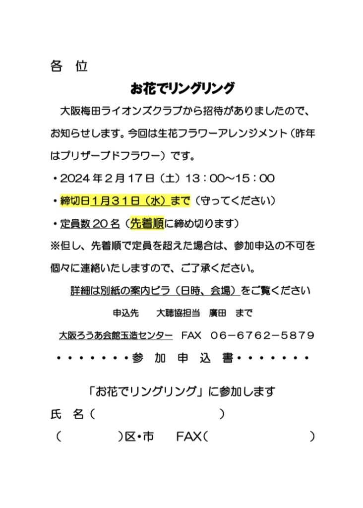 2/17(土) 大聴協女性部の行事の申込のお知らせ