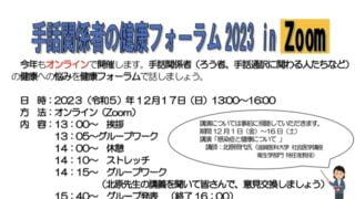 情報共有12/17(日)「手話関係者の健康フォーラム2023 in ZOOM」の案内 大聴協事務局からの情報です。連盟より「手話関係者の健康フォーラム2023 in ZOOM」の案内です。 ●手話関係者の健康フォーラム2023 in ZOOM日 時 :2023年12月17日(日)13:00~16:00場 所 : オンライン(... 2023.10.28情報共有