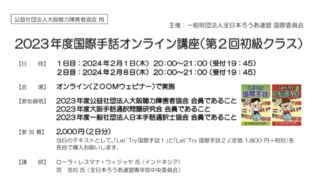 情報共有2023年度国際手話オンライン講座(第2回初級クラス)のご案内 大聴協事務局からの情報です。 連盟より2024年2月1日(木)、2月8日(木)と2回にわたって開催される『2023年度国際手話オンライン講座(第2回初級クラス)』開催について連絡がありました。申し込み締切日は2024年1月17日(水)までで... 2023.12.27情報共有
