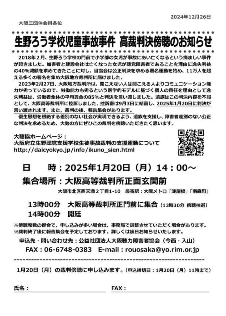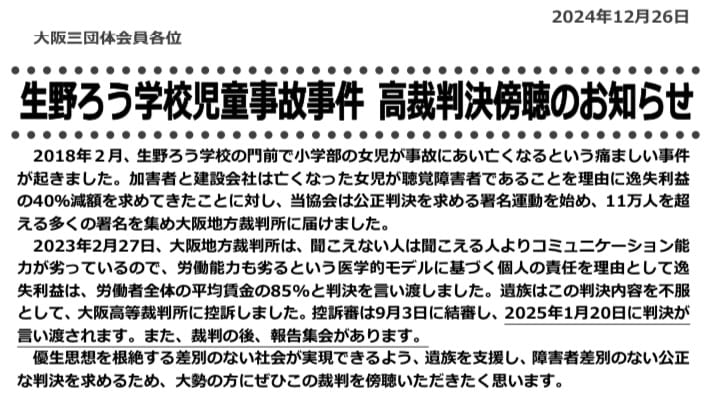 情報共有旧優生保護法1/20(月) 生野ろう学校児童事故事件 高裁判決傍聴のお知らせ 情報共有Screenshot2025.01.07大聴協事務局からの裁判傍聴案内です。・1/20 生野ろう学校児童事故事件 高裁判決傍聴のお知らせ20250120裁判傍聴呼びかけダウンロード