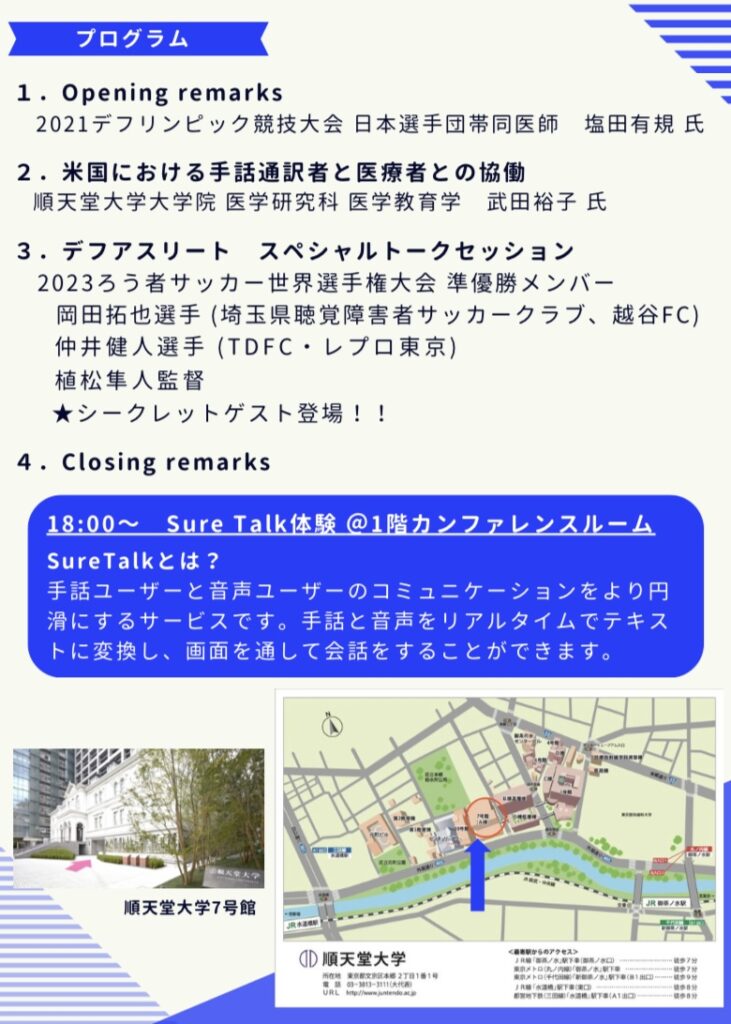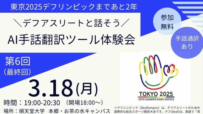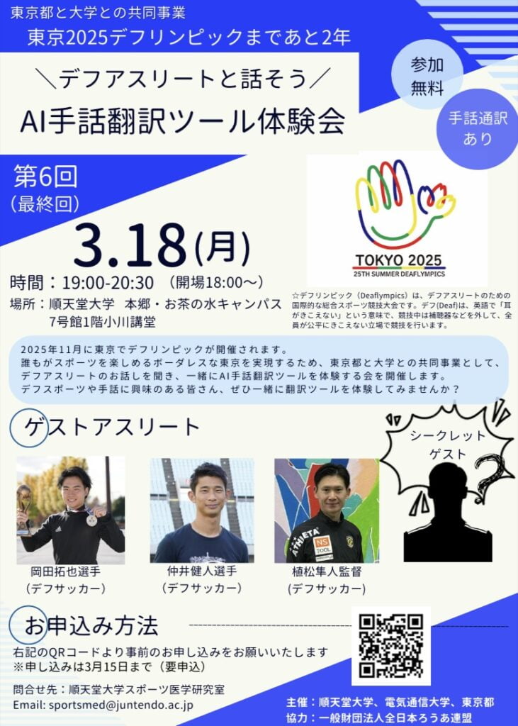 順天堂大学 3月18日 (日)「デフアスリートと話そうAI手話翻訳ツール体験会」のご案内