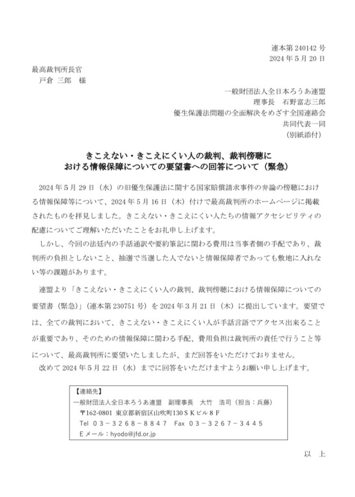全日本ろうあ連盟は、3月に最高裁判所に対して「きこえない・きこえにくい方々の裁判及び裁判傍聴における情報保障」に関する要望書を提出いたしました。