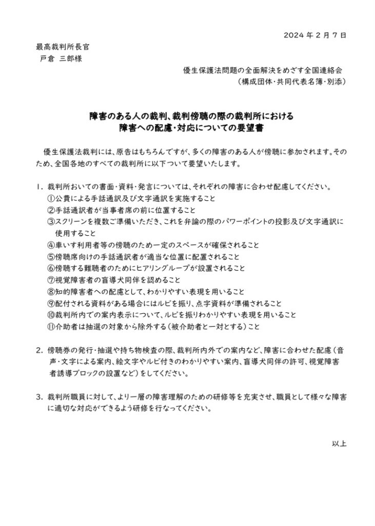 しかしながら、要望である「法廷内での情報保障(手話通訳・要約筆記)について、その費用と準備は最高裁が責任をもって行う」という重要な点に対し、最高裁判所からの回答が未だにありません。