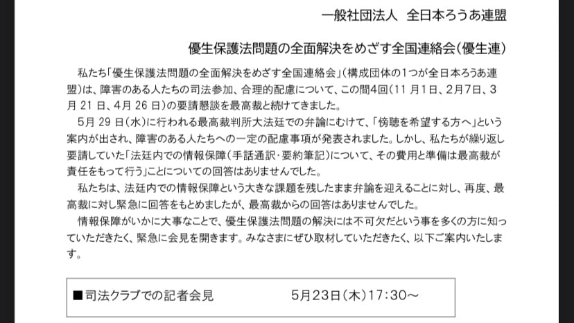 5月29日(水)に行われる最高裁判所大法廷における優生保護法裁判の弁論に向け、「傍聴を希望する方へ」という案内が公開されました。