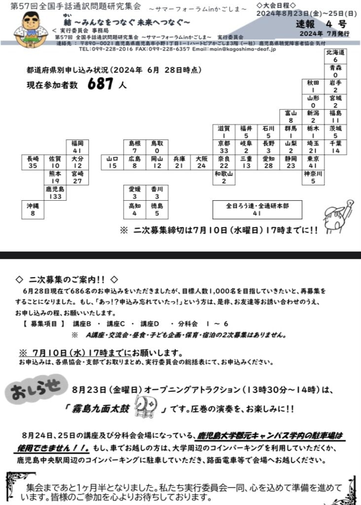 情報共有全通研サマーフォーラム第57回全国手話通訳問題研究集会サマーフォーラムin かごしま 速報第4号 情報共有2024.07.10大聴協事務局からの情報です。第57回全国手話通訳問題研究集会サマーフォーラムin かごしま 速報第4号です。サマーフォーラムinかごしま 速報第4号.pdfダウンロード