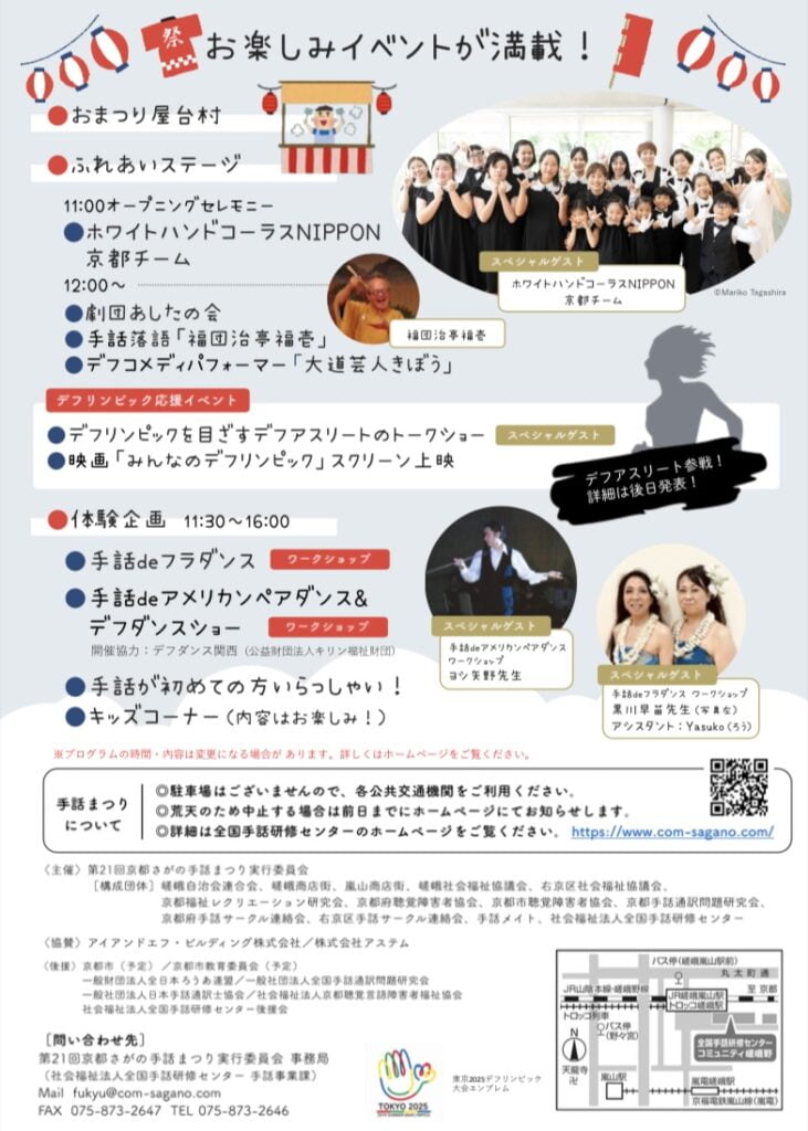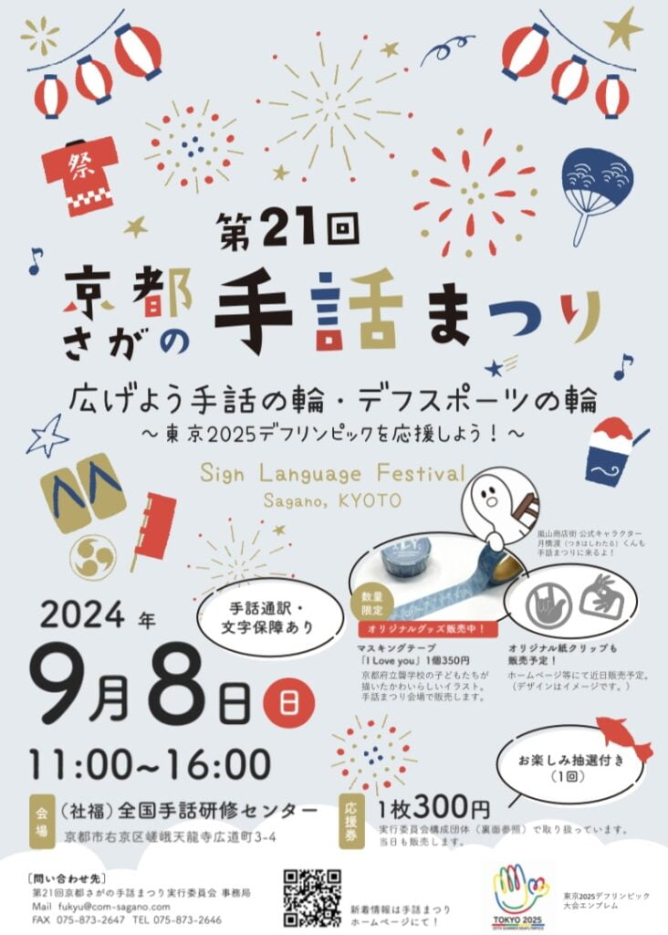 社会福祉法人全国手話研修センターより9月8日に開かれる「第21回京都さがの手話まつり」案内です。