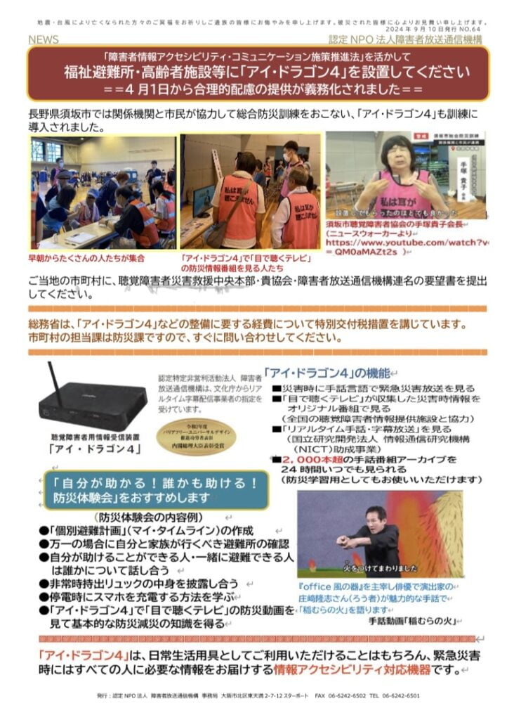 情報共有アイ・ドラゴンアイ・ドラゴン4普及ニュース第64号 情報共有2024.09.18大聴協事務局からの情報です。アイ・ドラゴン4普及ニュース第64号です。アイ・ドラゴン 4 | 株式会社アステムアイ・ドラゴンは聴覚障害者の方向けの手話と字幕の番組「目で聴くテレビ」を見るために必要な専用受信機です。「目で聴くテレビ」は災害時のテレビの情報に対して手話や字幕による「情報保障番組」や「独自の番組」を制作・放送しております。アイ・ドラゴン64号.pdfダウンロード