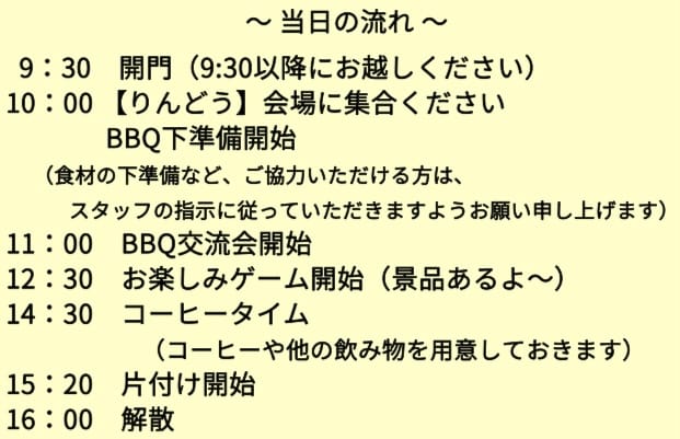 お知らせBBQ交流会10/20(日)BBQ交流会の追加情報のお知らせ お知らせ2024.09.3010月20日(日)のバーベキュー交流会の追加情報です。定員まで、あと残りわずかとなりますので、ご参加の検討されている方はお早めにお願いします。下記はBBQ交流会当日の流れと、駐車場のお知らせになります。BBQ当日の流れ駐車場のお知らせ10/20(日) バーベキュー交流会10月20日(日)に和泉市デフネット連絡協議会の企画でBBQ交流会をやります!詳細は下図のビラをご確認ください。※去年の開催場所と変わっておりますのでご注意ください。去年はバリアフリーサイトでしたが、今年はオークサイトでやります。 ※参加条...