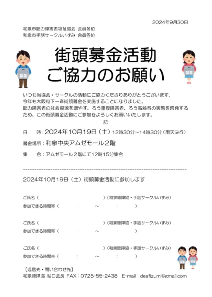 聴力障害者の社会資源を増やす、ろう重複障害者、ろう高齢者の実態を啓発するため、この街頭募金活動にご参加をよろしくお願いいたします。
