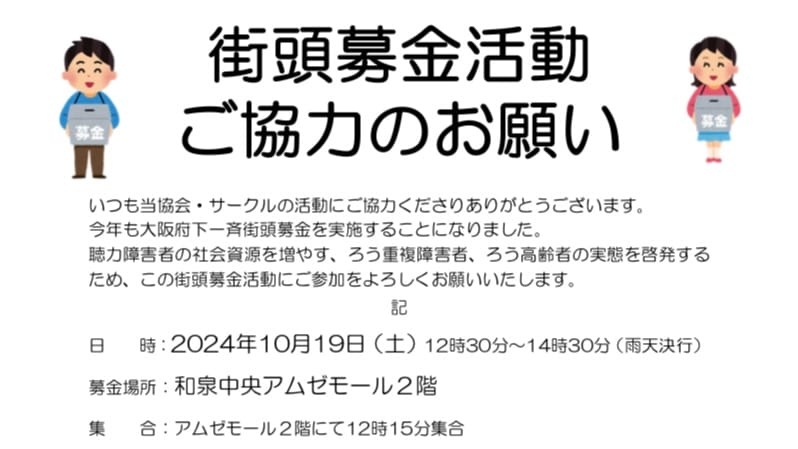 聴力障害者の社会資源を増やす、ろう重複障害者、ろう高齢者の実態を啓発するため、この街頭募金活動にご参加をよろしくお願いいたします。