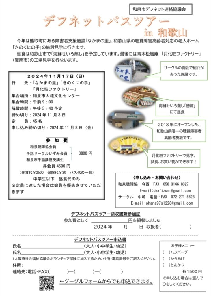 11月17日(日)に和泉市デフネット連絡協議会の企画で日帰りバスツアーがあります。