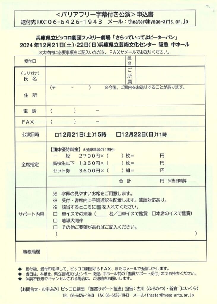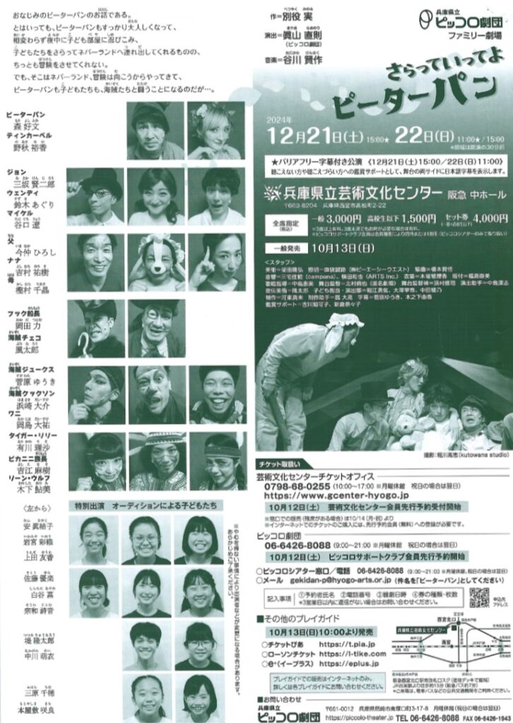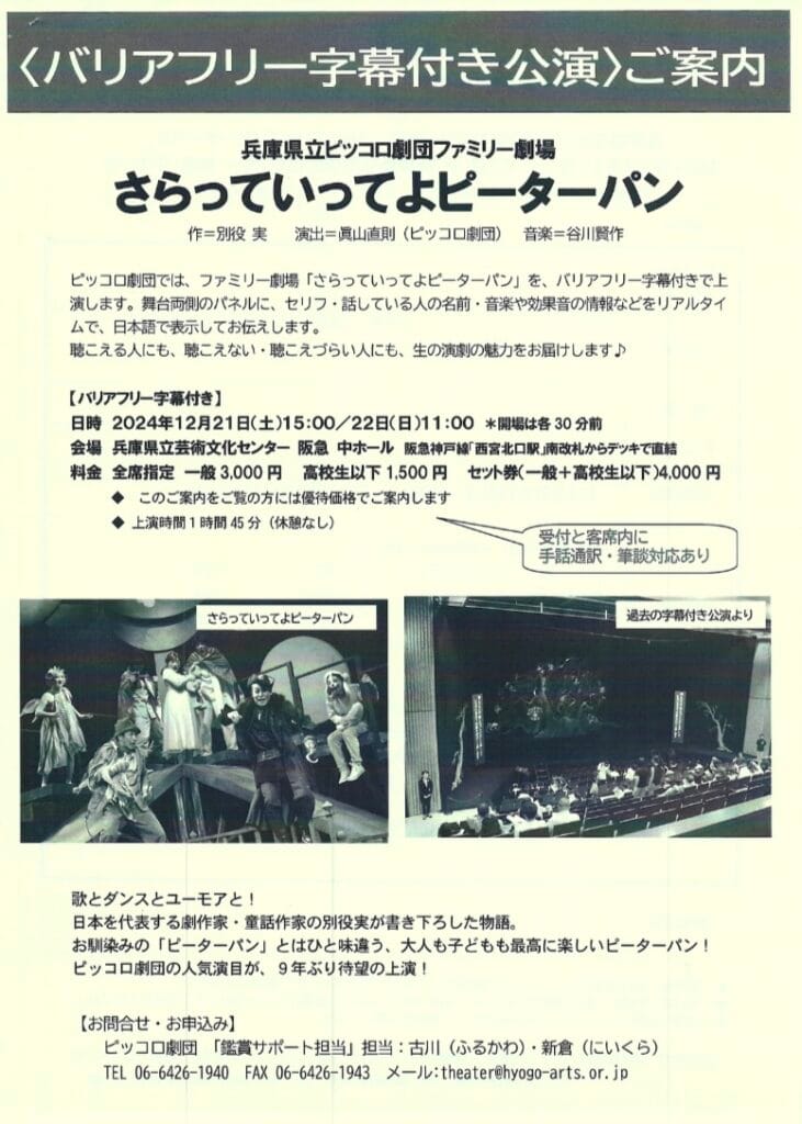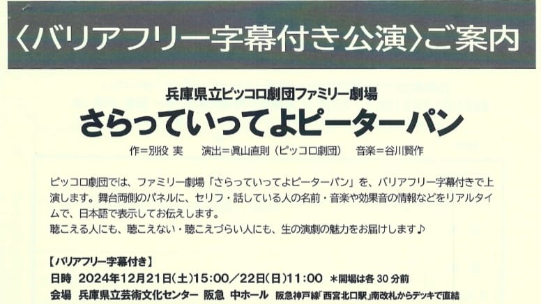 情報共有ピッコロ劇団バリアフリー字幕公演のお知らせ 情報共有Screenshot2024.12.10大聴協からの連絡です。バリアフリー字幕公演のお知らせです。詳細は下図のとおりです。バリアフリー字幕公演案内.pdfダウンロードさらっていってよピーターパン.pdfダウンロード