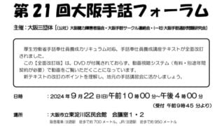 情報共有第21回大阪手話フォーラム 大聴協事務局からの情報です。9月22日に開催される大阪手話フォーラム案内を送ります。-----『第21回大阪手話フォーラム』 手話言語の明るい未来をみんなで創りましょう。手話奉仕員養成講座のテキストがリニューアルしたので、どんなものになって... 2024.08.20情報共有