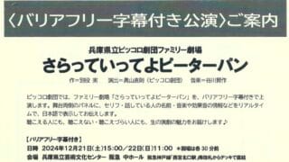 情報共有バリアフリー字幕公演のお知らせ 大聴協からの連絡です。バリアフリー字幕公演のお知らせです。 詳細は下図のとおりです。 バリアフリー字幕公演案内.pdfダウンロード さらっていってよピーターパン.pdfダウンロード 2024.12.10情報共有