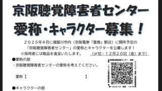 情報共有京阪聴覚障害者センターの愛称、キャラクター募集の連絡 京阪聴覚障害者センターの愛称、キャラクター募集のチラシについて連絡です。 詳細は下図のとおりです。 京阪センター愛称・キャラ募集.pdfダウンロード 2024.12.06情報共有