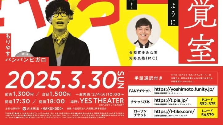 3/30 吉本興業お笑いライブ「視聴覚室」のお知らせ | 公益社団法人 大阪聴力障害者協会 http://daicyokyo.jp/info/20250330.html