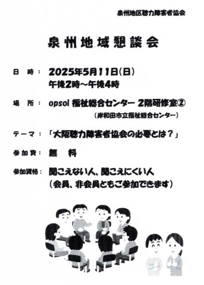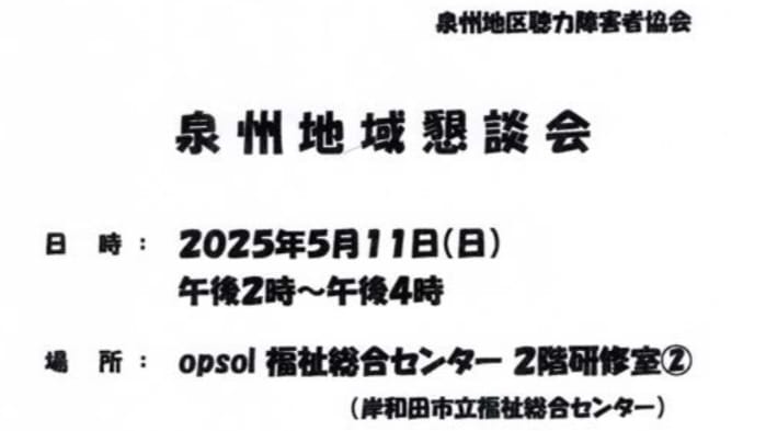 情報共有泉聴協5/11(日)泉州地域懇談会のお知らせ 情報共有Screenshot2025.04.11泉聴協からの連絡です。泉州地域懇談会のお知らせです。詳細は下図のとおりです。泉州地域懇談会ダウンロード