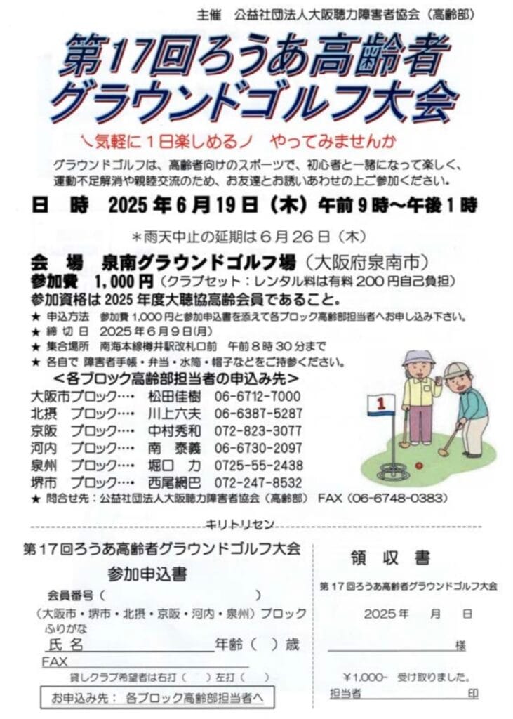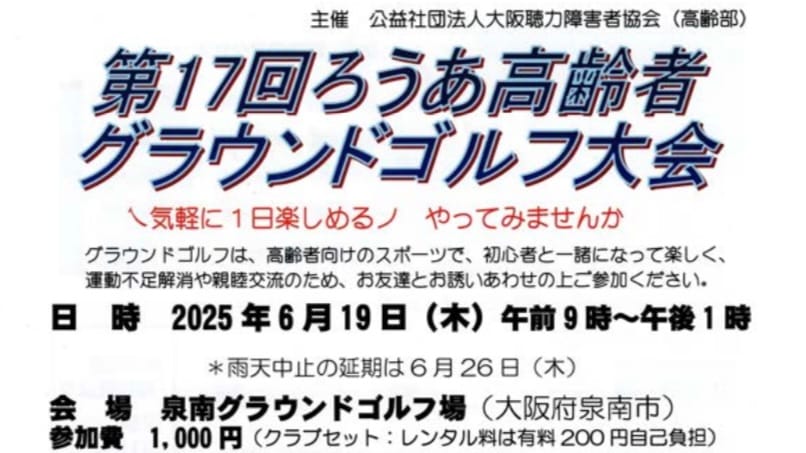 情報共有大聴協高齢部6/19(木) 第17回グラウンドゴルフ交流会のお知らせ 情報共有Screenshot2025.04.13大聴協高齢部からのお知らせになります。第17回グラウンドゴルフ交流会のチラシです。申込締切は、6月9日(月)までとなっております。詳細は下図のとおりです。17-ろうあ高齢者グラウンドゴルフ大会ダウンロード