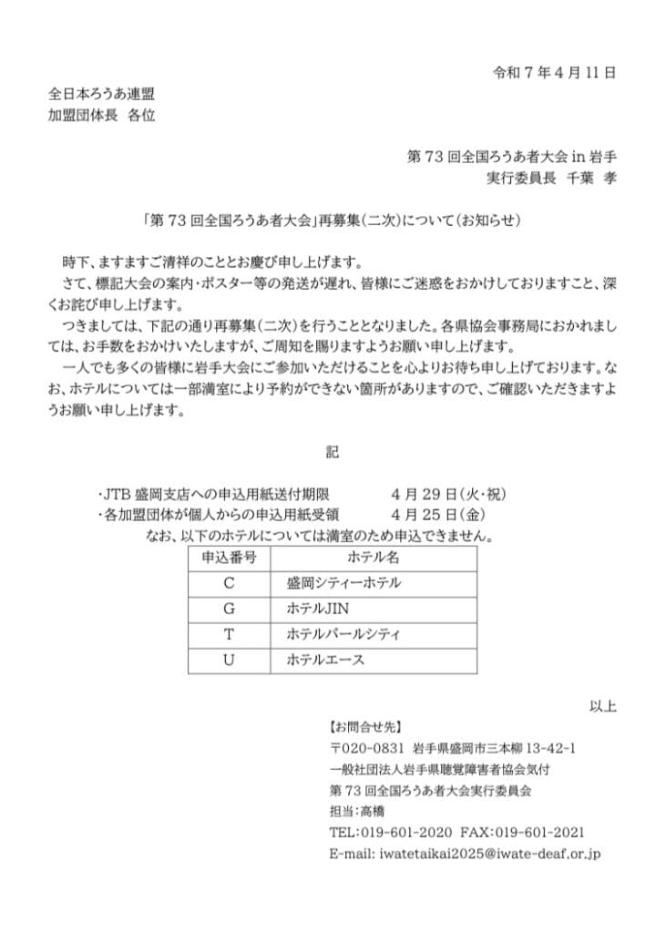 6月に開催される「第73回全国ろうあ者大会inいわて」再募集について連絡がありました。