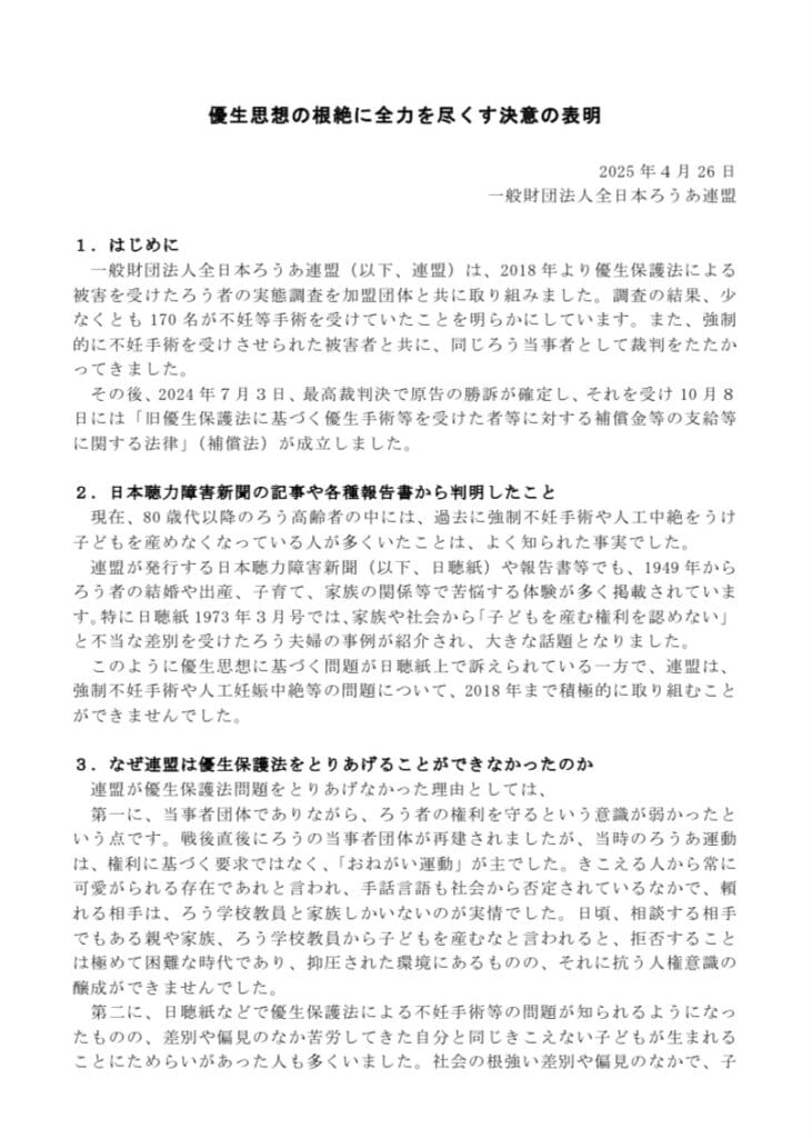 全日本ろうあ連盟が4月26日に優生思想の根絶に全力を尽くす決意の表明を発表しました。