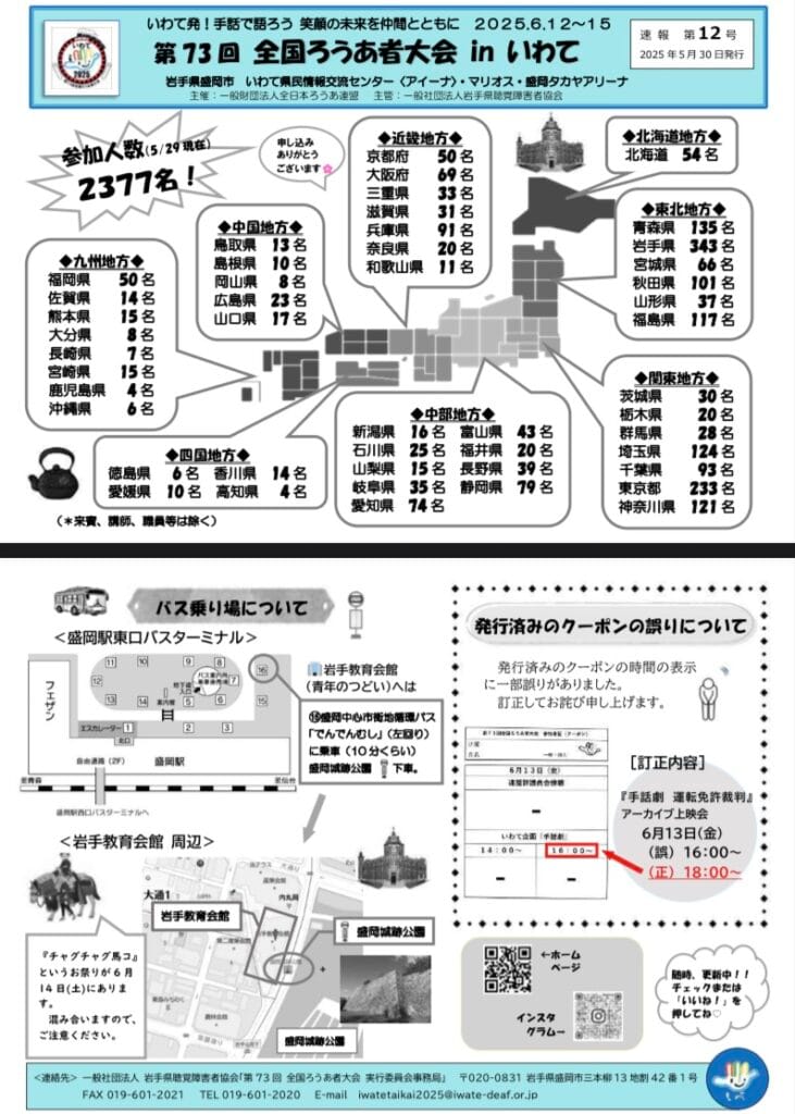 情報共有全国ろうあ者大会第73回全国ろうあ者大会inいわて速報12号 情報共有Screenshot2025.06.08大聴協事務局からの情報です。第73回全国ろうあ者大会inいわて速報12号です。大会HP https://www.iwate-deaf.or.jp速報12号(白黒印刷用)ダウンロード