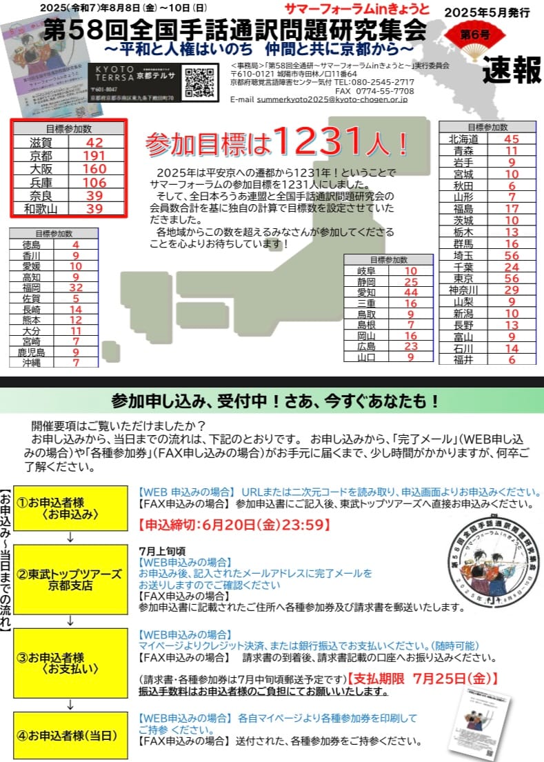 情報共有全通研サマーフォーラム「第58回全国手話通訳問題研究集会サマーフォーラムin きょうと」速報6号 情報共有Screenshot2025.06.11大聴協事務局からの情報です。大聴協事務局からの情報です。「第58回全国手話通訳問題研究集会サマーフォーラムinきょうと」速報6号です。第58回全国手話通訳問題研究集会サマーフォーラムinきょうと第58回全国手話通訳問題研究集会 サマーフォーラムinきょうと 〜平和と人権はいのち 仲間と共に京都から〜 …SF2025inきょうと速報第6号ダウンロード