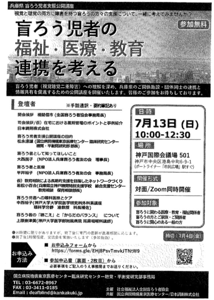 情報共有盲ろう7/13(日) 「盲ろう児 医療・福祉・教育連携」のお知らせ 情報共有Screenshot2025.06.27大聴協事務局から「盲ろう児 医療・福祉・教育連携」のお知らせになります。締切日は7月4日(金)までです。詳細は下図のとおりです。20250713盲ろう児者ダウンロード