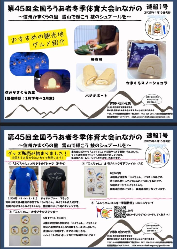 情報共有全国ろうあ者体育大会第45回全国ろうあ冬季体育大会inながの速報第1号 情報共有Screenshot2025.07.02大聴協事務局からの情報です。第45回全国ろうあ冬季体育大会inながの速報第1号です。第45回全国ろうあ者冬季体育大会㏌ながの【第1号】全国ろうあ冬季体育大会inながの 速報ダウンロード