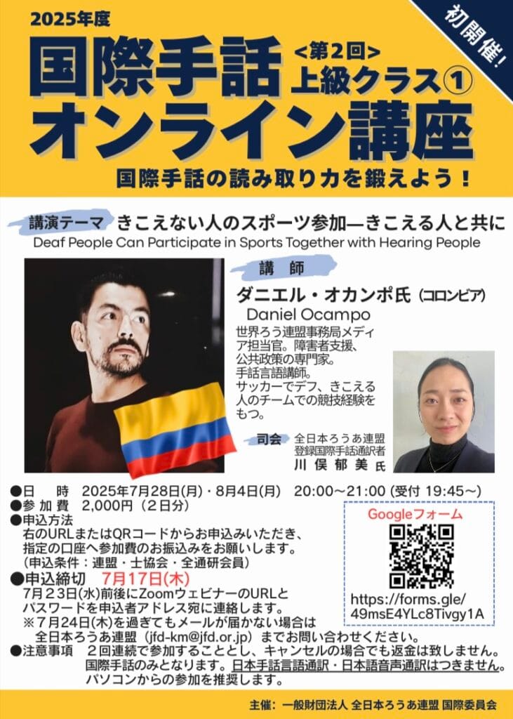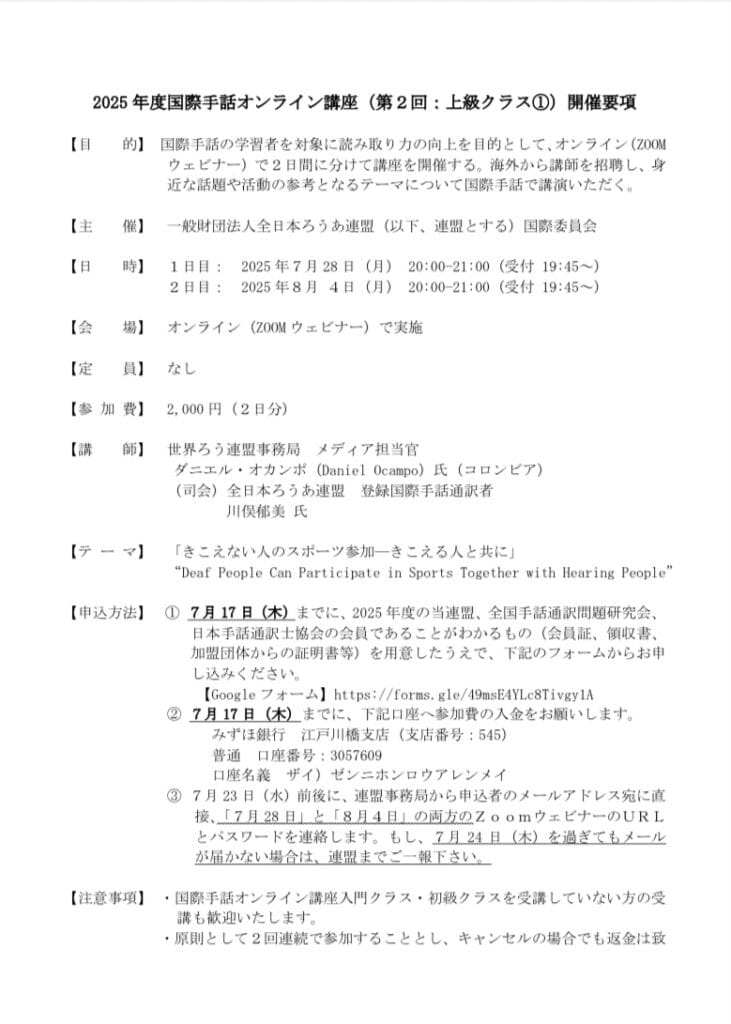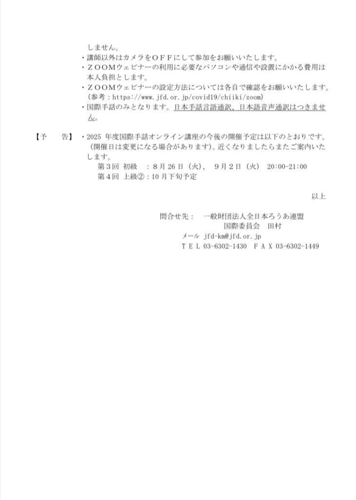 連盟より『2025年度国際手話オンライン講座(第2回:上級クラス①)』案内がありました。