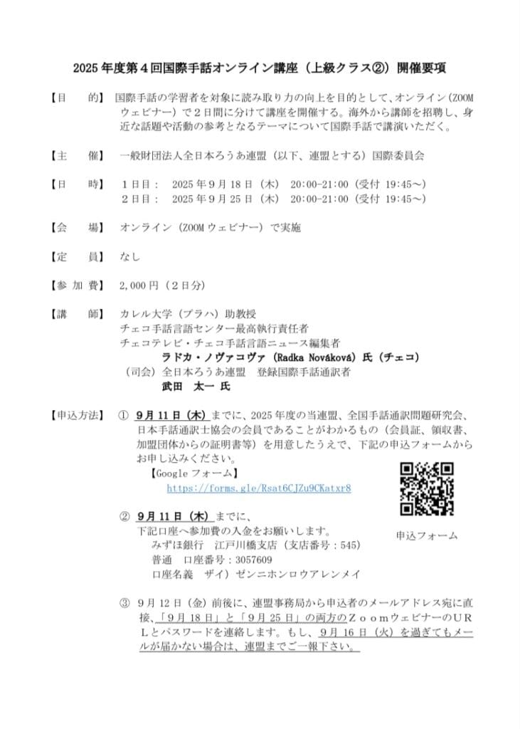 申し込み方法は、前回と同様、全日本ろうあ連盟へ直接申し込み(Googleフォーム)です。申し込み締切日は2025年9月11日(木)までです。