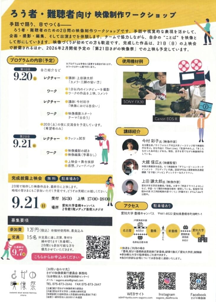 情報共有さがの映像祭第21回さがの映像祭 情報共有Screenshot2025.09.07大聴協事務局からの情報です。「第21回さがの映像祭」映像作品募集案内になります。第21回さがの映像祭ダウンロード映像制作ワークショップダウンロード