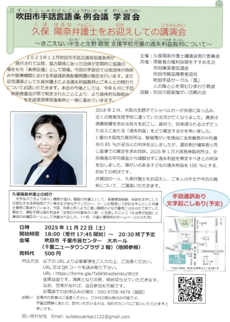 情報共有日弁連11/22(土) 吹田市手話言語条例会議 学習会 情報共有Screenshot2025.09.09大聴協事務局からの情報です。下図の通り、学習会(講演会)の情報提供です。20251122吹田市学習会ダウンロード