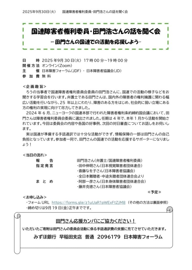 連盟より「国連障害者権利委員・田門浩さんの話を聞く会」の案内がありました。