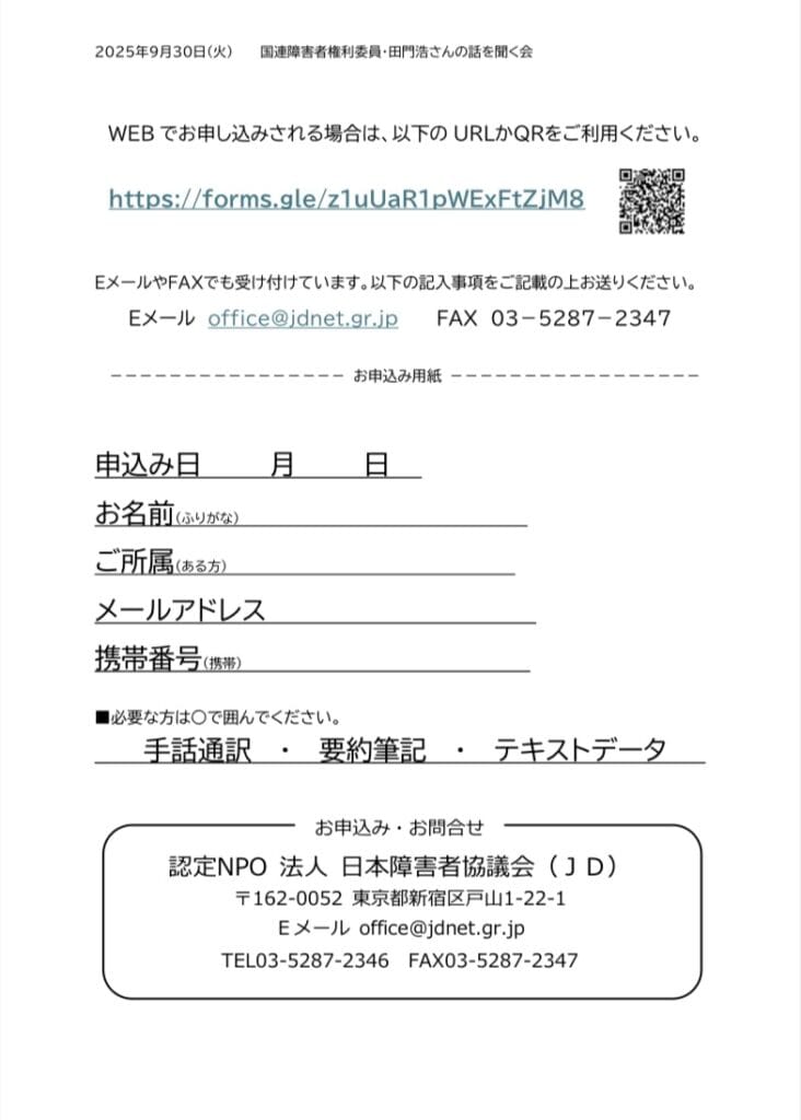 この度、日本障害フォーラム(JDF)と日本障害者協議会(JD) にて表記の学習会を開催することになりました。