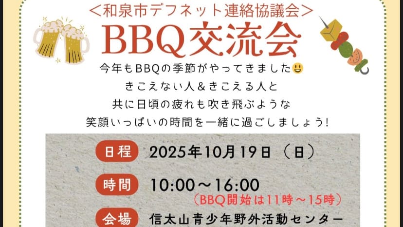 10月19日(日)にデフネット連絡協議会主催のバーベキュー交流会を開催します。