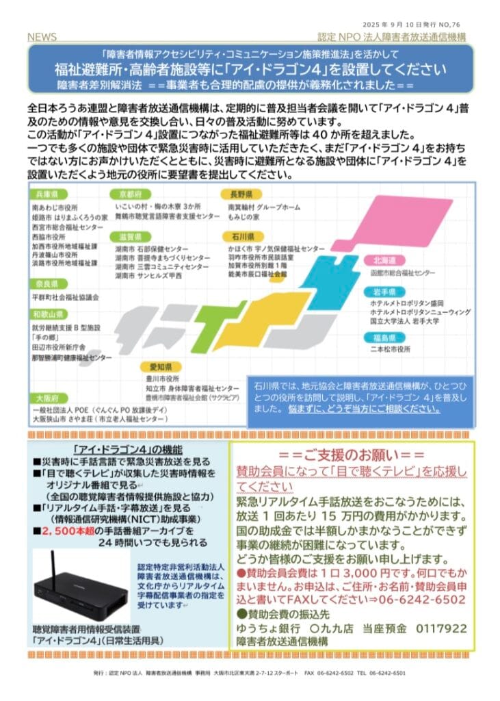 情報共有アイ・ドラゴンアイ・ドラゴン4普及ニュース第76号 情報共有2025.09.20大聴協事務局からの情報です。アイ・ドラゴン4普及ニュース第76号です。アイ・ドラゴン 4 | 株式会社アステムアイ・ドラゴンは聴覚障害者の方向けの手話と字幕の番組「目で聴くテレビ」を見るために必要な専用受信機です。「目で聴くテレビ」は災害時のテレビの情報に対して手話や字幕による「情報保障番組」や「独自の番組」を制作・放送しております。【2025年9月10日発行NO、76】ニュースダウンロード
