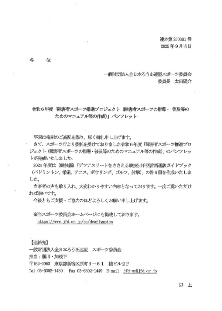 情報共有デフリンピック情報提供(競技別通訳ガイドブック) 情報共有2025.09.21大聴協事務局からの情報です。競技別手話言語通訳ガイドブックについてダウンロード東京2025デフリンピック大会ポータルサイト東京2025デフリンピック | TOKYO 2025 DEAFLYMPICS東京2025デフリンピック 大会情報サイトは、公益財団法人東京都スポーツ文化事業団デフリンピック準備運営本部が運営するサイトです。東京2025デフリンピックに関する大会情報や当本部が行う大会の準備・運営等について発信していきます。
