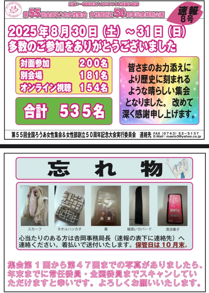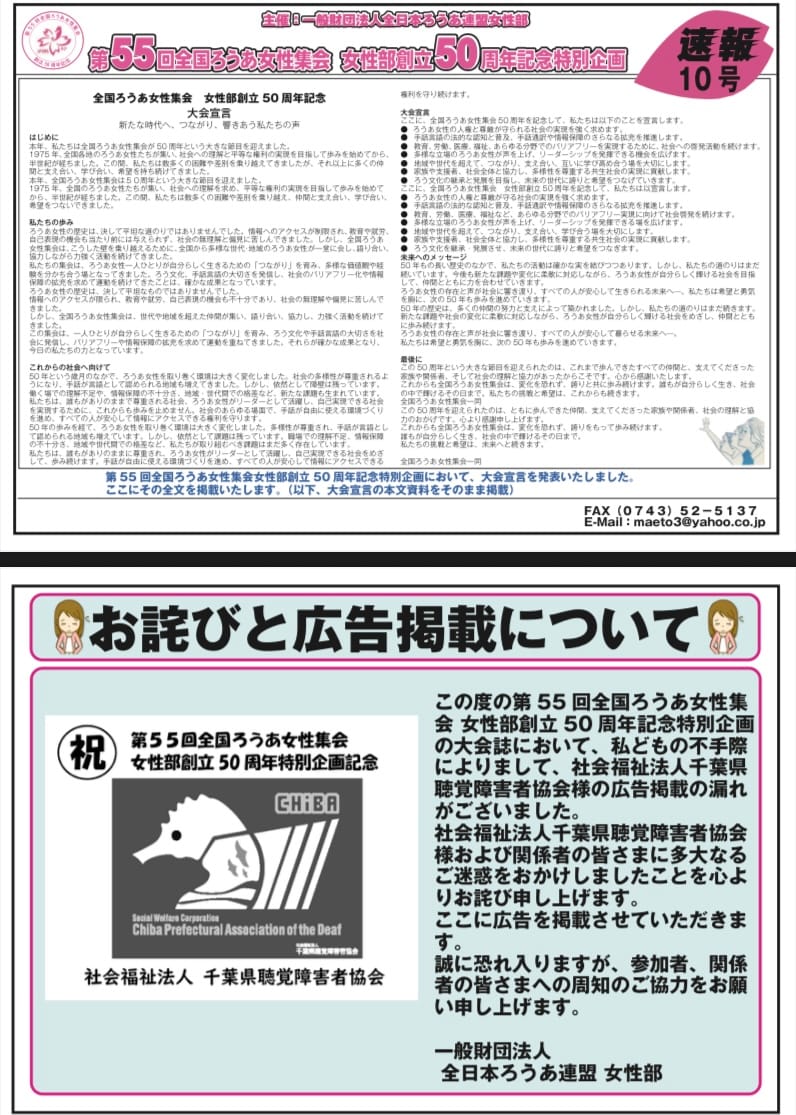 連盟より全国ろうあ女性集会・女性部創立50周年記念特別企画の速報第8,9,10号です。