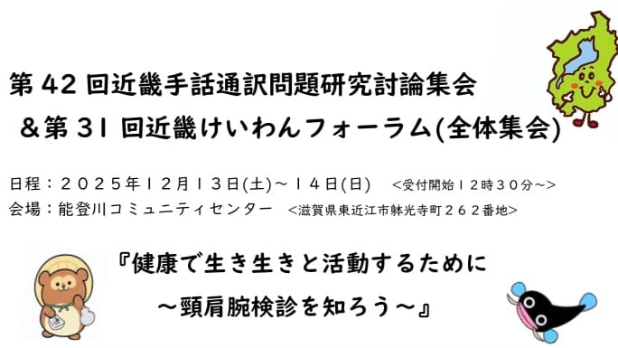 情報共有近通研第42回近畿手話通訳問題研究討論集会&第31回近畿けいわんフォーラムin滋賀のご案内 情報共有Screenshot2025.09.29大聴協事務局からの情報です。滋賀協会より第42回近畿手話通訳問題研究討論集会&第31回近畿けいわんフォーラム(全体集会)の案内が届きました。詳細は下記のファイルをご確認ください。案内の詳細は、こちらのPDFをダウンロードください近通研集会案内兼申込書ダウンロード