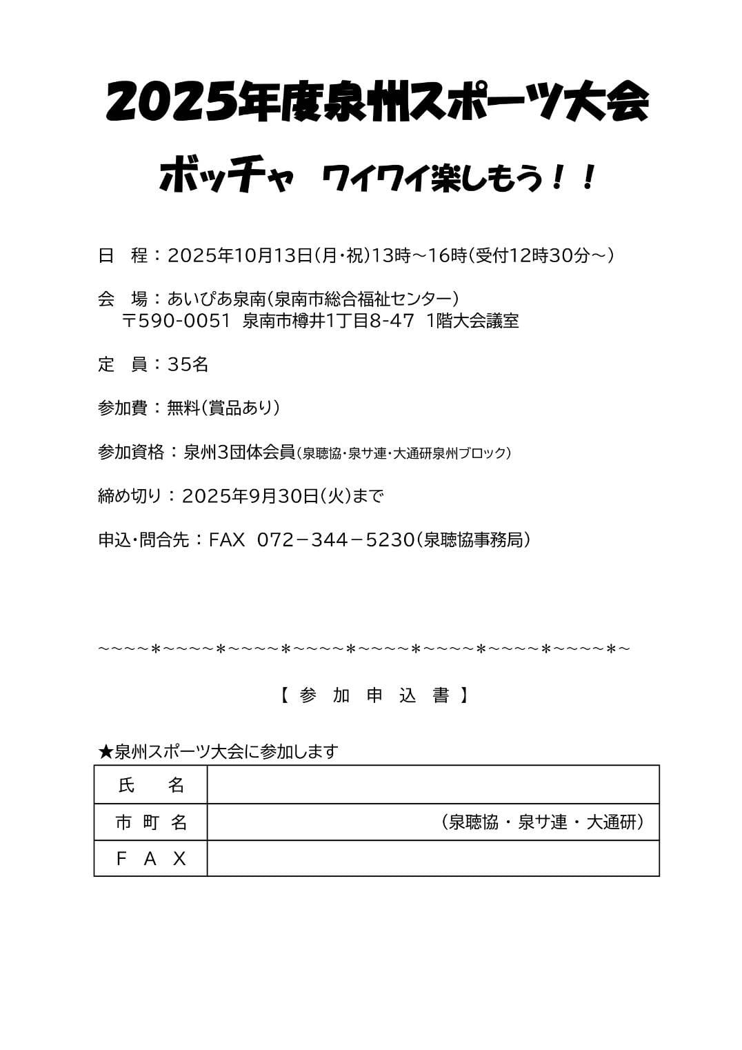 10月13日(月・祝)に開催される泉州スポーツ大会の参加申し込み締め切りを 10月7日(火)まで 延長しました!