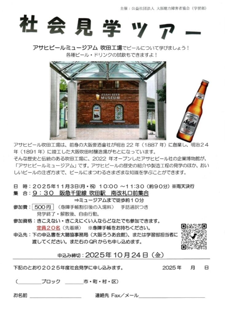 2025年11月3日(月•祝)にアサヒビールミュージアム 吹田工場の見学ツアーが、あります。