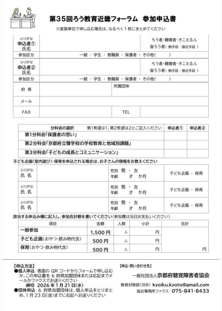 京都府聴覚障害者協会より2/8に開催される「第35回ろう教育近畿フォーラムin京都」の案内がありました。