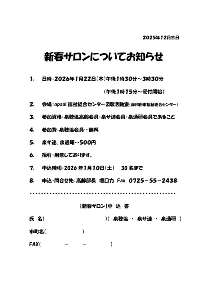 情報共有高齢部1/22(水) 新春サロンのお知らせ 情報共有Screenshot2025.12.19泉州地区聴力障害者協会高齢部から新春サロンのお知らせです。申込締切は、1月10日(土)までとなっております。詳細は下図のとおりです。2026新春サロンダウンロード
