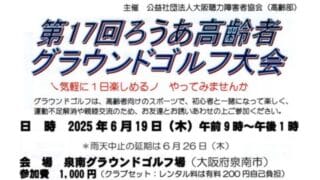 情報共有6/19(木) 第17回グラウンドゴルフ交流会のお知らせ 大聴協高齢部からのお知らせになります。第17回グラウンドゴルフ交流会のチラシです。申込締切は、6月9日(月)までとなっております。 詳細は下図のとおりです。 17-ろうあ高齢者グラウンドゴルフ大会ダウンロード 2025.04.13情報共有