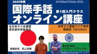 情報共有2025年度国際手話オンライン講座(第1回入門クラス)のご案内 大聴協事務局からの情報です。 連盟より2025年6月26日(木)、7月3日(木)と2回にわたって開催される『2025年度国際手話オンライン講座(第1回入門クラス)』開催について連絡がありました。申し込み締切日は2025年6月17日(火)まで... 2025.05.05情報共有