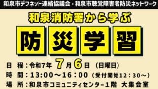 お知らせ7/6(日) 防災学習会のお知らせ 7月6日(日)に和泉市立コミュニティーセンターで和泉市聴覚障害者防災ネットワークと和泉市デフネット連絡協議会の共同学習会を開催します。詳細については下記のサイトページをご覧ください。 たくさんのご参加お待ちしております。 2025.06.12お知らせ