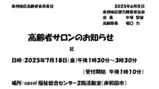 情報共有7/18(金) 高齢者サロンのお知らせ 泉州地区聴力障害者協会高齢部から高齢者サロンのお知らせです。申込締切は、7月15日(火)までとなっております。 詳細は下図のとおりです。 泉州地区高齢者会員各位2025年6月吉日ダウンロード 2025.06.14情報共有